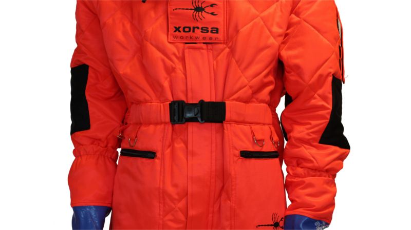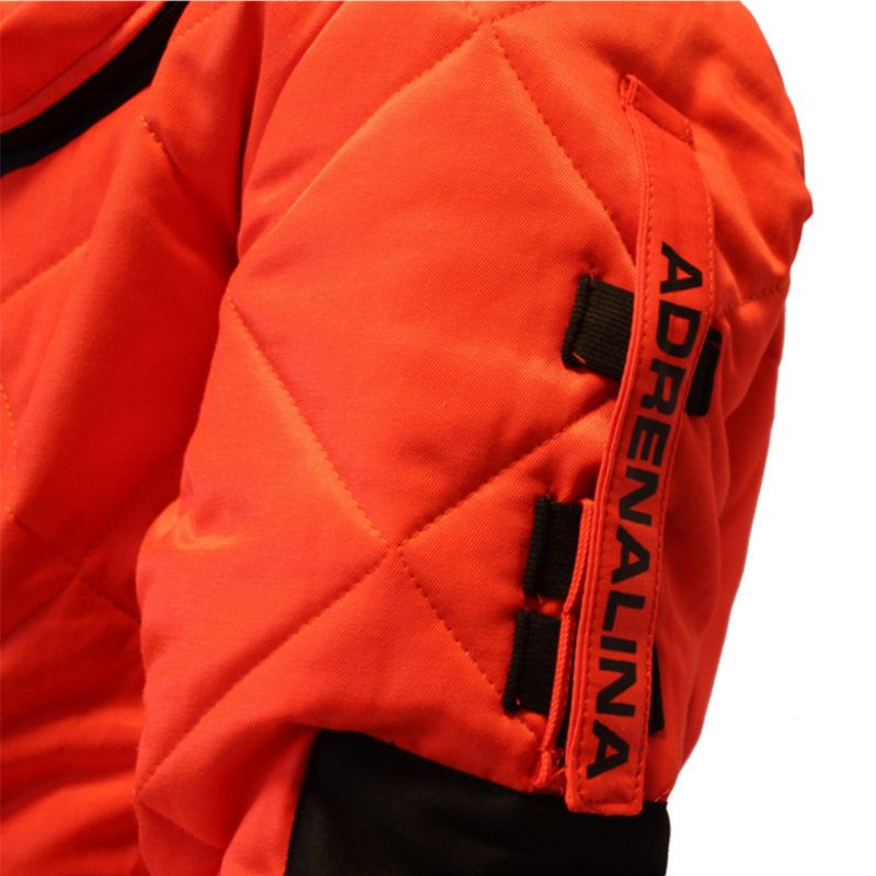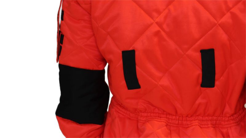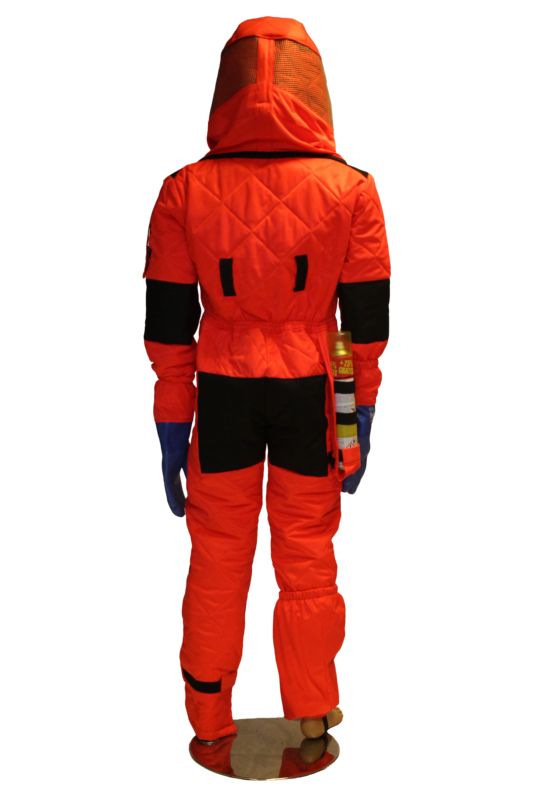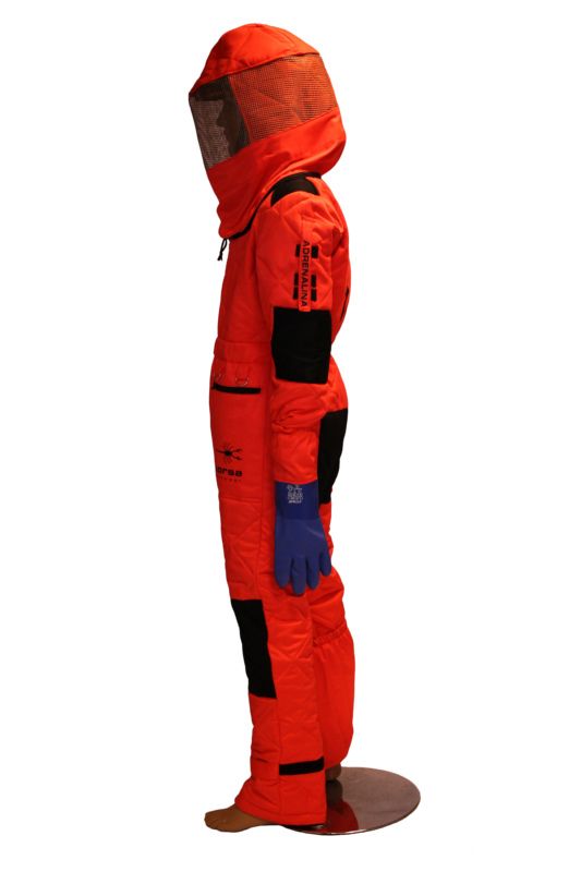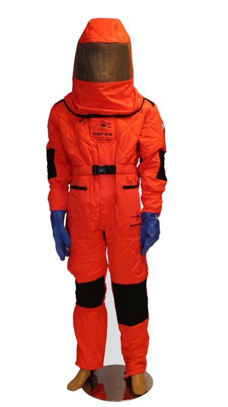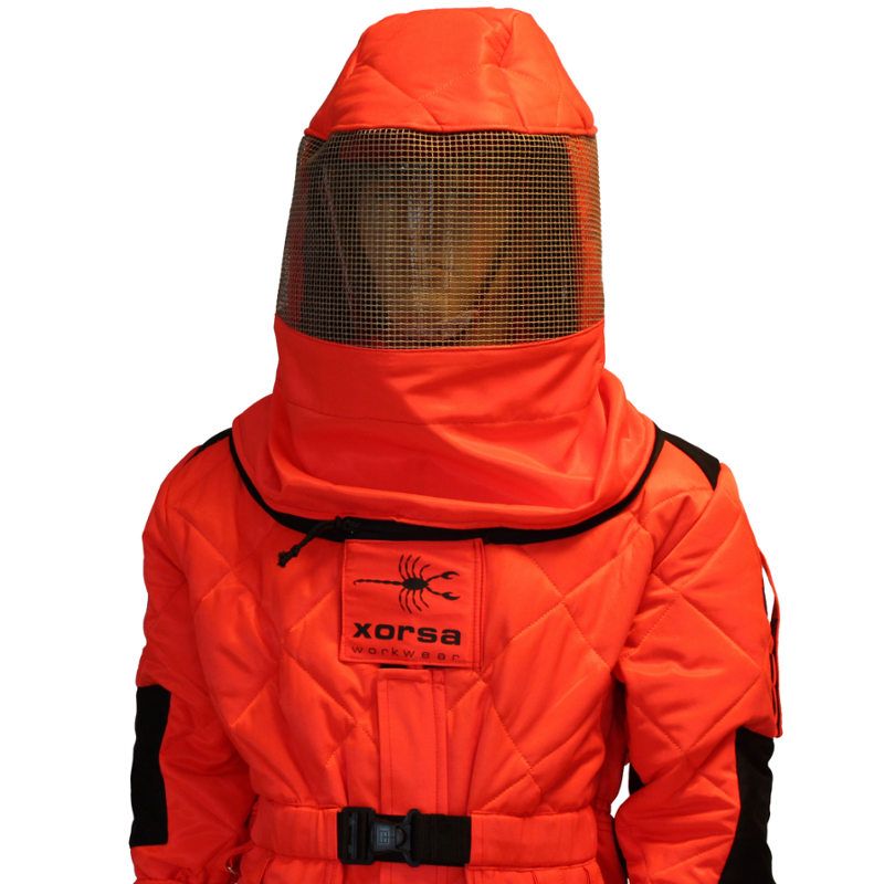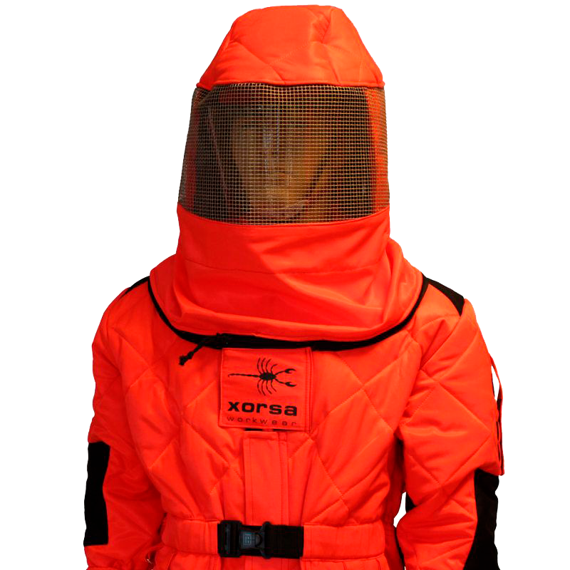 Buzos de seguridad patentado contra la Avispa Velutina fabricado con tejido con doble capa y mullido de poliéster en color rojo fluorescente.